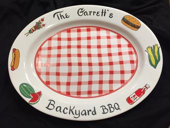 9. OVAL CERAMIC BBQ PLATTERS: 16.5 x 13" Two designs (Red Gingham or BBQ Grill)